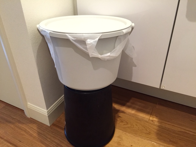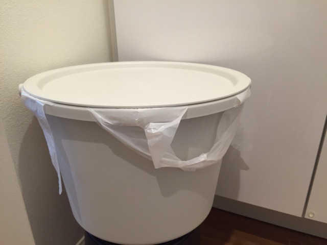 ただ、夜中に寝ぼけながら低い位置のポリバケツのフタをしゃがんで開けるのはいやだな~と思い、下に昔100均で買ったゴミ箱を裏返して・・・その上に乗せて使っています。