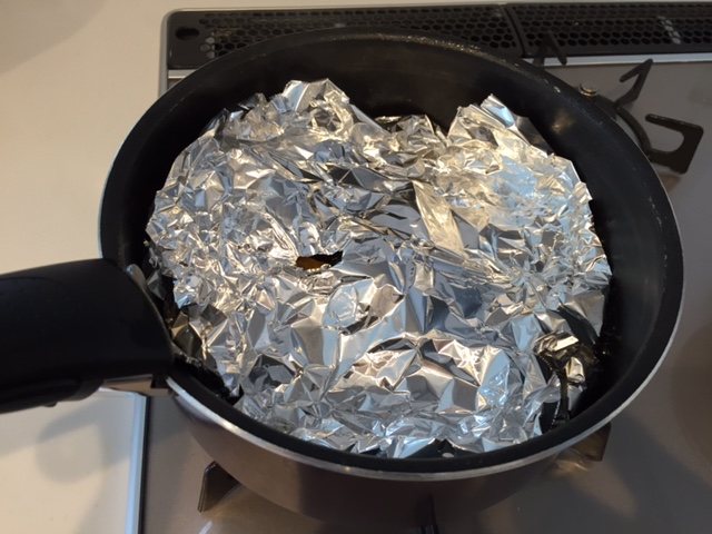 調味料と水を入れた鍋にかぼちゃを並べて火をいれます。我が家では弱火~中火にしてアルミホイルで落し蓋をして5分~10分煮ます。目を離すとあっという間に煮汁がなくなってしまうので、気を付けています(゚ー゚;A