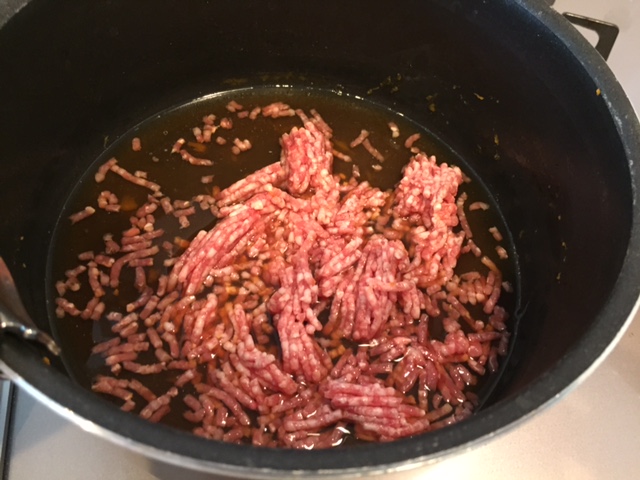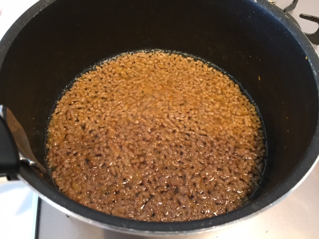 煮汁(少し煮詰めすぎて少なくなっていたら、水をちょっと足してもOK)に、しょうがと豚ひき肉を足してグツグツ煮詰めます。※しょうがの香りが最高です。