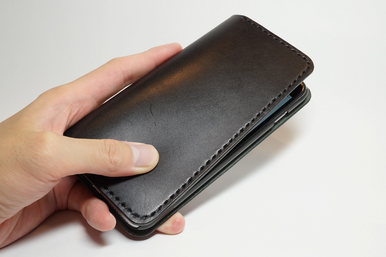 栃木レザーの黒、糸も黒、ケースも黒、内ポケットは最小限で1つ。