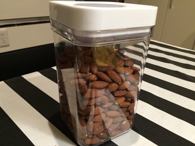 ニトリで購入したワンプッシュキャニスター1100ml(上の画像)に入れるとアーモンド500g(1パック分)でこれくらいの分量になります。