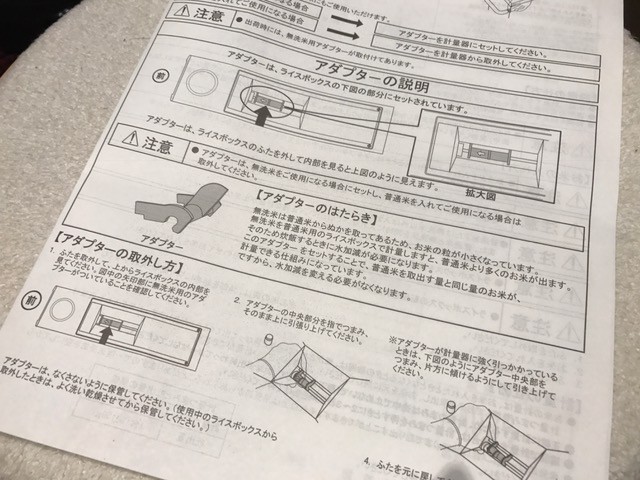我が家では冬場は凍るように水が冷たいので無洗米をつかっていますが(※春~秋まではコスパ重視で普通米)無洗米を使う場合はアダプターを取り付けます。ちょっと面倒ですが、年2回程度のことだし、時々中をお掃除したりすると思うので許容範囲かな~と。