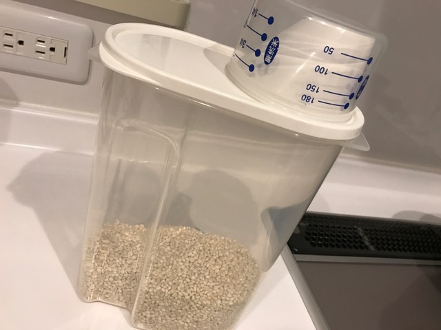 今まで使っていた米びつは、主人と結婚前に冷蔵庫を買いに行った時に・・・確かヨドバシカメラかの店舗で付録的に頂いたもので、もう5年半近く使っています。(※写真はお米でなくて、今入れている流行りのもち麦w)