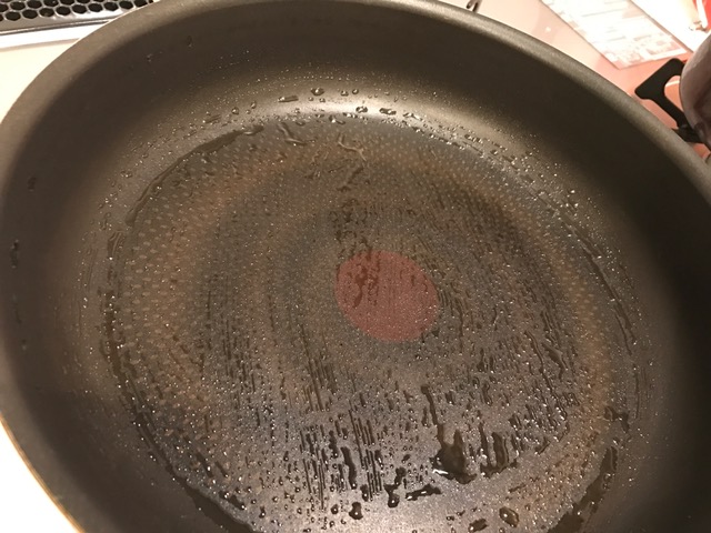 油を入れるとこんな感じ。(※先日、主人がお好み焼きを焼いたときに汚れたフライパンで何度も使ってしまい・・・焦げカスが油に混ざっております(汚))↓↓↓